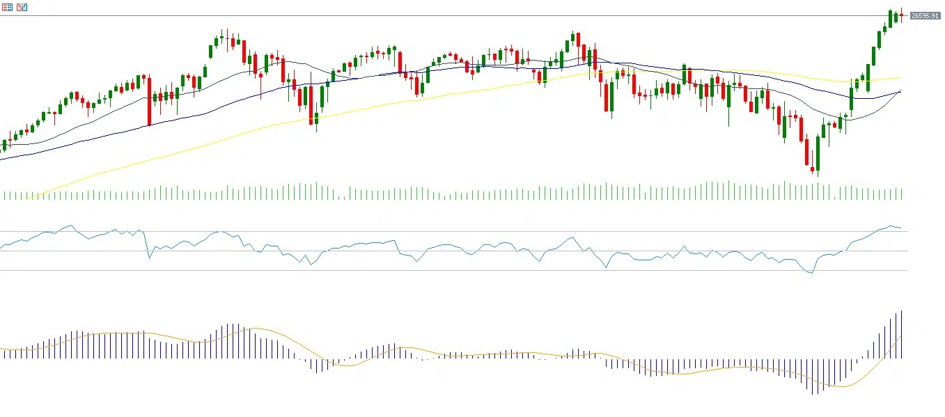From a technical perspective, the Nasdaq 100 reached a record high of 26,730 points before closing at 26,479 points. The Relative Strength Index currently stands at 70, indicating overbought conditions and strong upward momentum. In addition, a bullish crossover has appeared between the MACD line and the signal line, supporting the continuation of positive momentum. Moreover, a bullish or golden crossover has occurred between the 20-day moving average and the 50-day moving average, which may signal further upside potential.