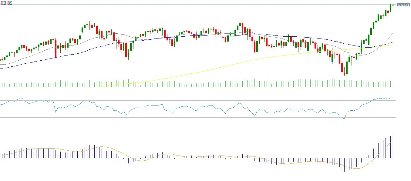 ارتفع مؤشر Nasdaq 100 بنحو 2.37% خلال الأسبوع الماضي وذلك للأسبوع الرابع على التوالي، مسجلًا مستوى قياسيًا جديدًا عند 27,314 نقطة، ثم أغلق عند 27,304 نقطة مرتفعًا بنحو 8% منذ مطلع العام حتى اليوم.