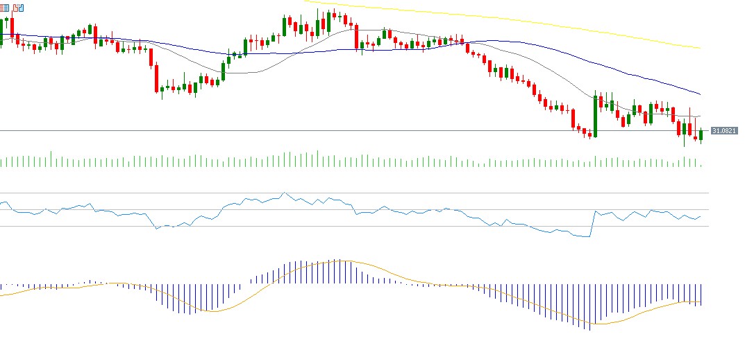ويُسجّل مؤشر القوة النسبية (RSI) حاليًا نحو 39 نقطة، ما يشير إلى زخم سلبي لزوج الدولار الأميركي مقابل البات التايلاندي. كما يظهر تقاطع هبوطي بين خط MACD وخط الإشارة، ما يعزّز احتمالات استمرار الزخم السلبي للزوج.