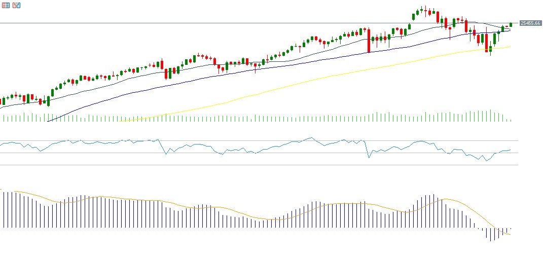 ارتفع مؤشر Nasdaq100 خلال الأسبوع الماضي بنسبة تقارب 5%، إلا أن أداءه الشهري كان سلبيًا بنسبة 1.64% بعد سبعة أشهر متتالية من الارتفاعات. وأغلق المؤشر يوم الجمعة عند مستوى 25,435 نقطة. وتراجع مؤشر التقلب VIX إلى ما دون 16 نقطة، وهو أدنى مستوى منذ شهر. وتشير التوقعات إلى استمرار الزخم الإيجابي في الأسهم الأميركية خلال الفترة المقبلة رغم ارتفاع التقييمات، وذلك بدعم من النتائج المالية لمعظم الشركات الأميركية التي فاقت توقعات المحللين، خصوصًا شركات التكنولوجيا الكبرى المرتبطة بالذكاء الاصطناعي المعروفة بـ”السبع العظماء” (Magnificent 7)، إضافة إلى زيادة رهانات الأسواق على خفض أسعار الفائدة بواقع 25 نقطة أساس في اجتماع الفيدرالي في 10 ديسمبر بنسبة 85%. ويسجل مؤشر القوة النسبية (RSI) حاليًا 56 نقطة، ما يشير إلى الزخم الصعودي للمؤشر. كما يُظهر مؤشر MACD تقاطعًا صعوديًا بين خط MACD وخط الإشارة، مما يدعم الاتجاه الصعودي للناسداك100.