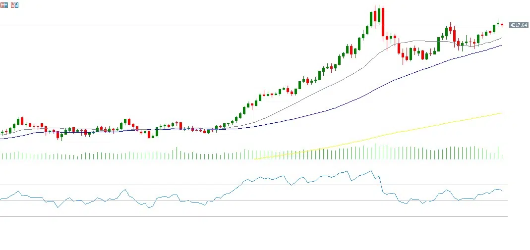 أما فنيًا، فهناك استمرار في انتظام المتوسطات المتحركة لـ20 و50 و200 يوم، حيث يتجاوز متوسط الـ20 يومًا متوسط الـ50 يومًا، والذي بدوره يتجاوز متوسط الـ200 يوم، مما يعكس اتجاهًا صاعدًا على المديين المتوسط والطويل. ويسجل مؤشر القوة النسبية (RSI) حاليًا 63 نقطة، مما يعكس استمرار الزخم الإيجابي للذهب.