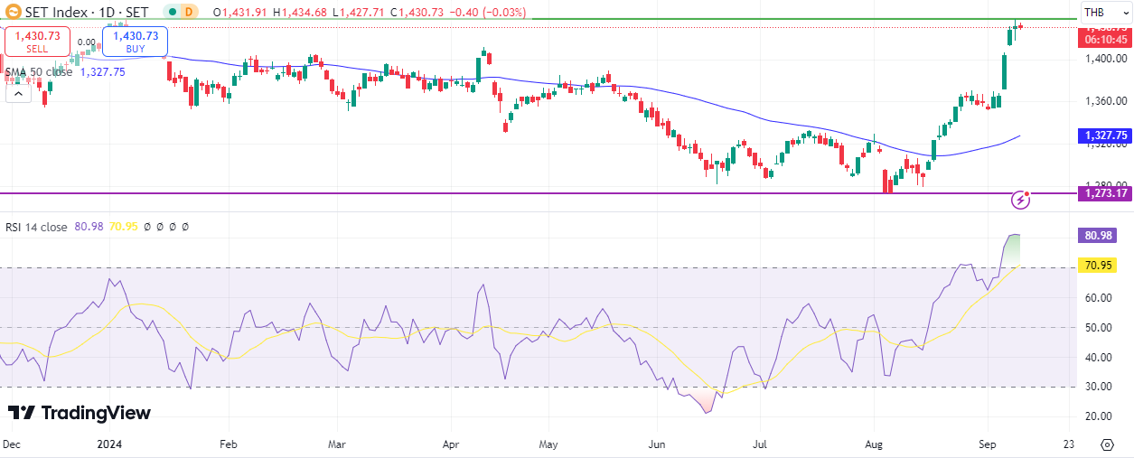 يواصل مؤشر SET التايلندي اتجاهه الصعودي لليوم السادس على التوالي، مسجلًا 1,438 نقطة بالأمس، وهو أعلى مستوى له منذ 18 أكتوبر 2023. فقد ارتفع هذا المؤشر بنحو 13% منذ قاع 5 أغسطس من هذا العام عندما سجل 1,273 نقطة، وصولًا إلى القمة التي سجلها بالأمس عند 1,438 نقطة. كما ارتفع بنحو 1% منذ بداية هذا العام حتى الآن.