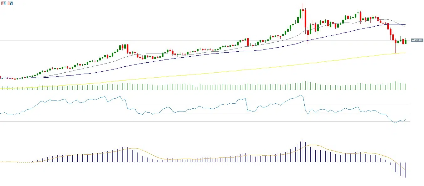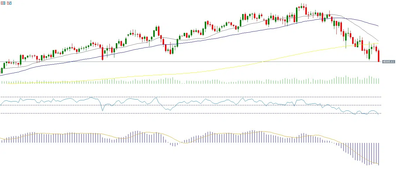 فنيًا، يسجل مؤشر القوة النسبية (RSI) مستوى 27 نقطة، أي في منطقة الإفراط في البيع، ما يشير إلى زخم سلبي للمؤشر. ويظهر مؤشر MACD تقاطعًا هبوطيًا بين خط MACD الأزرق وخط الإشارة البرتقالي، داعمًا النظرة السلبية للمؤشر.