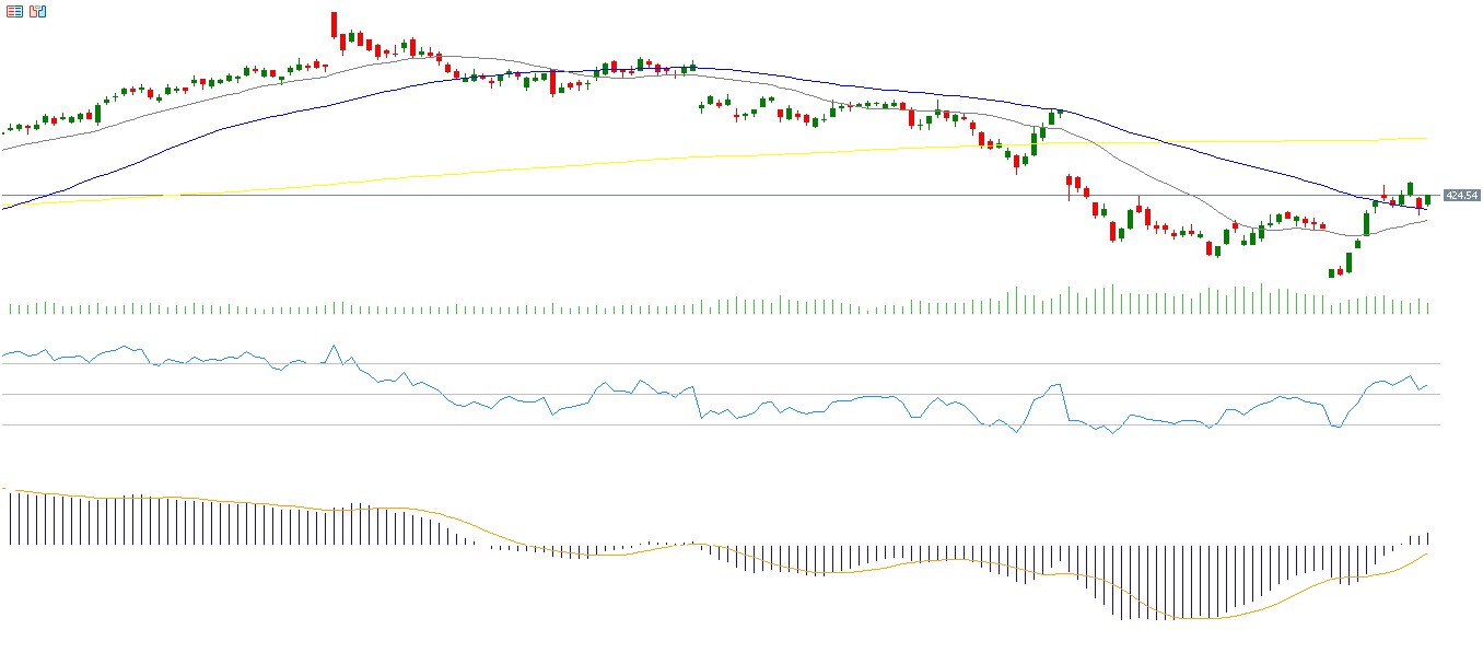 ويسجل مؤشر القوة النسبية (RSI) حاليًا 63 نقطة، مما يشير إلى الزخم الإيجابي لسهم مايكروسوفت. أما مؤشر MACD فيُظهر تقاطعًا صعوديًا بين مؤشر MACD باللون الأزرق وخط الإشارة (Signal Line) باللون البرتقالي، مما يعطي زخمًا إيجابيًا للسهم