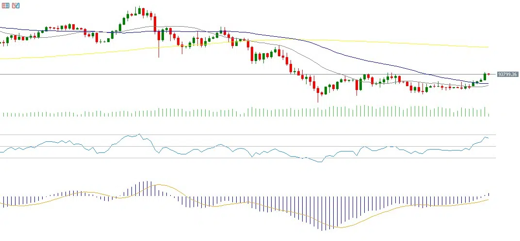 From a technical perspective, indicators support the continuation of the upward trend in Bitcoin prices. There is a clear convergence between the 20-day moving average and the 50-day moving average, with the potential for a golden cross, which would further strengthen the case for continued gains. The Relative Strength Index currently stands at 65, indicating strong bullish momentum, alongside a bullish crossover between the MACD indicator and the signal line, confirming the persistence of positive momentum.