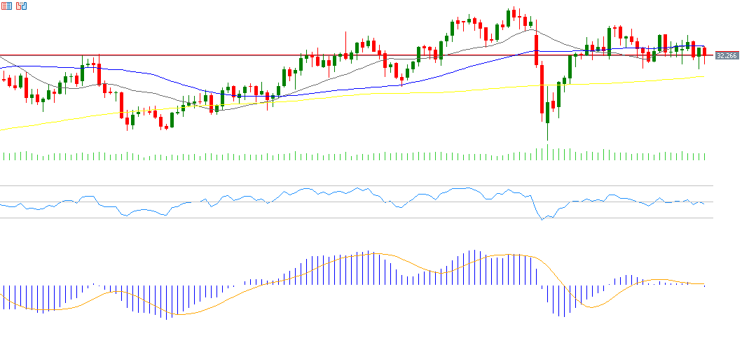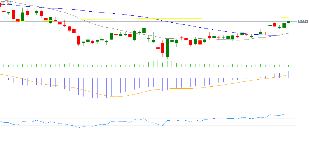 The RSI is currently at 70, reflecting strong upward momentum. The MACD also shows a bullish crossover, with the MACD line (blue) crossing above the signal line (orange), reinforcing positive momentum in the index.