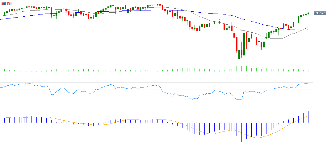 The S&P 500 index rose by about 5% last week, closing at 5,959 on Friday, May 16, 2025, marking its fifth consecutive daily gain.