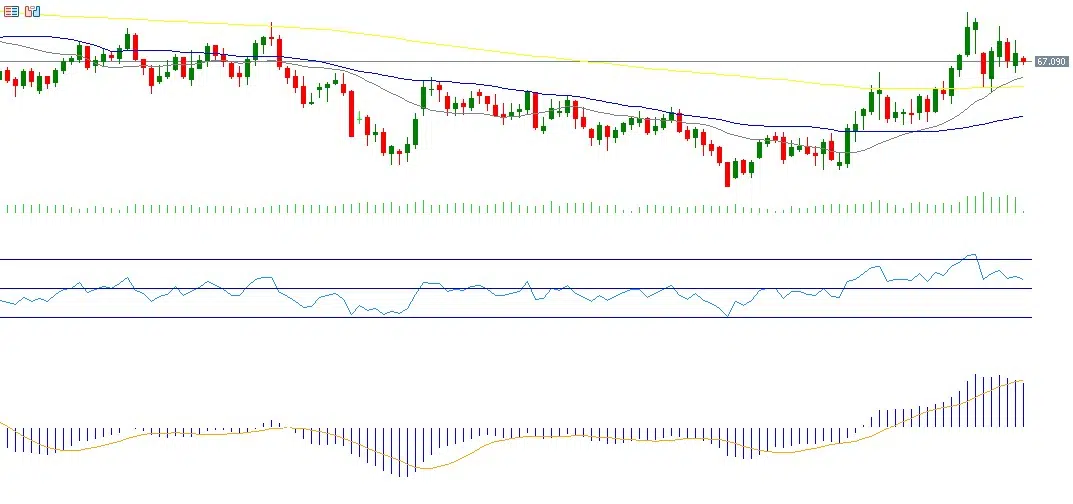 Crude oil prices declined by around 2.5% last week after five consecutive weeks of gains, closing near USD 68 per barrel on Friday. The pullback was driven by easing geopolitical tensions and ongoing negotiations between the United States and Iran, as well as talks between Ukraine and Russia aimed at reaching a truce or ceasefire. The RSI currently stands at 58, indicating continued bullish momentum, while the MACD shows a bullish crossover, supporting a constructive outlook for oil prices.