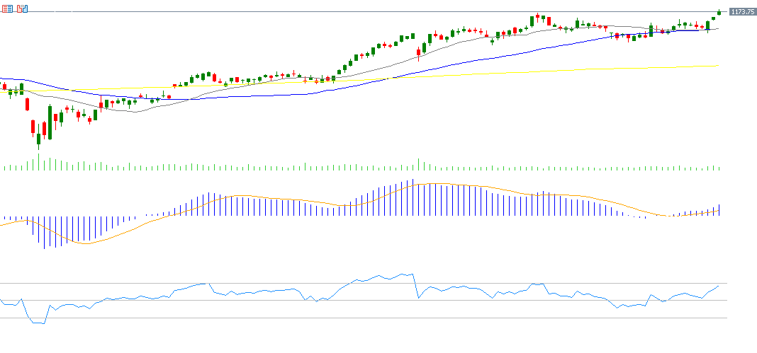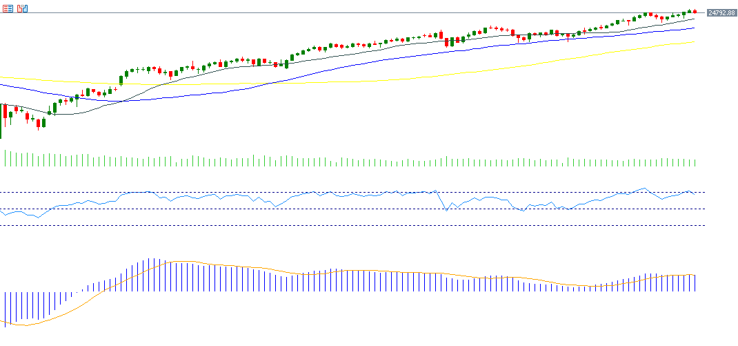 The Nasdaq100 rose about 1.15% last week, closing at 24,786 on Friday, October 3, 2025, and is up roughly 18% year-to-date. The gains are largely driven by strong momentum in major tech stocks linked to artificial intelligence, led by Nvidia, which hit a new record high on Thursday with a market capitalization of $4.57 trillion. The “Magnificent Seven” (MAGS) stocks also increased about 18% year-to-date. The Philadelphia Semiconductor Index (SOX) hit record highs on Friday, rising approximately 32% since the start of the year, reflecting strong demand for AI-related products and substantial investment inflows into the sector’s infrastructure. RSI currently stands at 67, signaling bullish momentum, with the MACD showing a bullish crossover, supporting the positive trend.