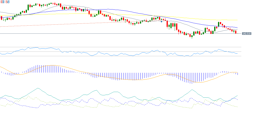 The USD/JPY pair traded at 142.42 on Friday, May 23 — its lowest level since May 7, 2025. The pair has declined approximately 9% year-to-date. The outlook remains bearish, influenced by several fundamental and technical factors. The Relative Strength Index (RSI) currently stands at 41, signaling bearish momentum. The MACD also shows a bearish crossover, with the MACD line (blue) crossing below the Signal Line (orange), reinforcing the negative sentiment for USD/JPY.