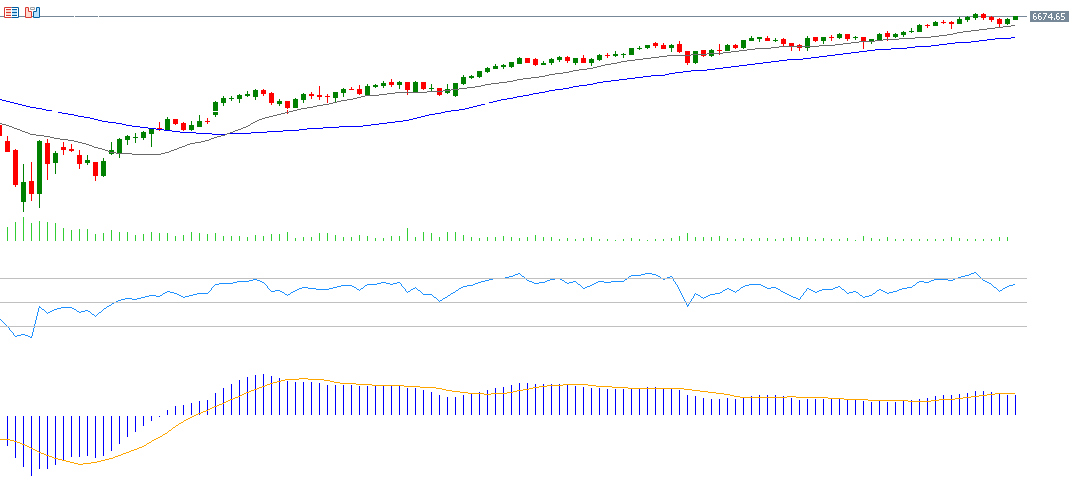 After three straight weeks of gains, the S&P 500 retreated 0.31 % last week. It had hit a record high of 6,700 on Tuesday, before closing at 6,644 on Friday. The index is up about 13 % year-to-date. The prevailing view is that U.S. equities can maintain upward momentum despite high valuations, aided by the Federal Reserve’s 25‑basis-point rate cut in its September meeting. Some forecasts suggest the possibility of another 50 bps in cuts this year. Mega‑caps (the “Magnificent Seven” / MAGS) reached fresh highs, rising ~18 % year-to-date, and the Philadelphia SOX index hit records with a ~27 % gain, driven in part by continued demand for AI-related infrastructure investments. The S&P 500’s RSI stands at 63, reflecting ongoing upward momentum.