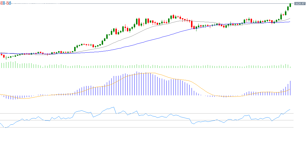 Platinum continues its strong upward trajectory, reaching $1,587 on Friday—its highest level since 2008. It has gained about 74 % year-to-date, outperforming assets such as gold (≈ 43 %) and silver (≈ 59 %). The upside momentum is supported by persistent supply constraints, robust industrial demand, and investor inflows into platinum ETFs. The RSI now reads 78, hinting at overbought conditions, while a bullish MACD crossover supports further upside potential.