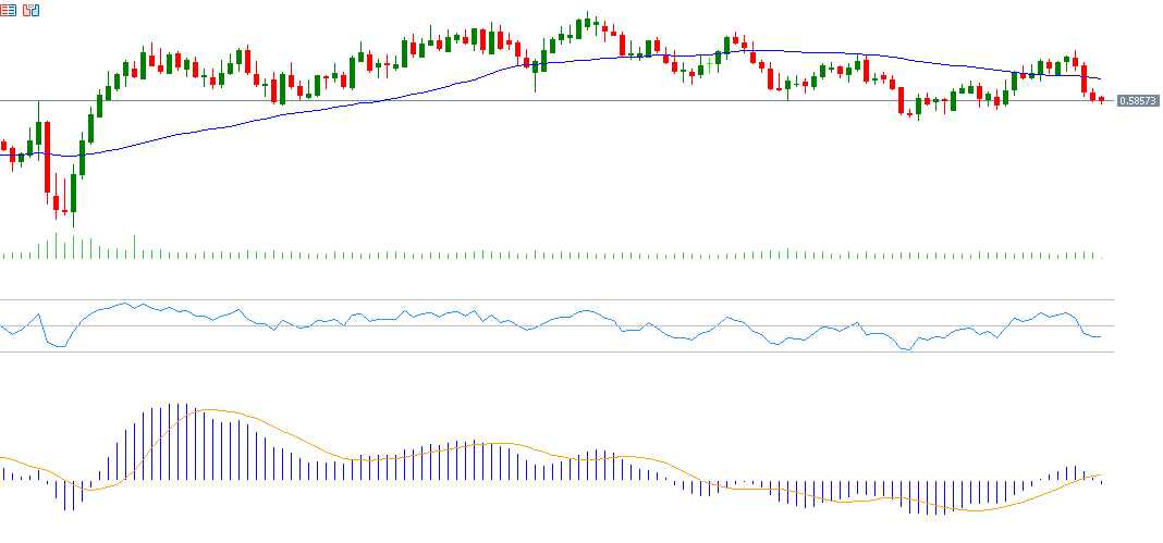 The New Zealand dollar weakened against the U.S. dollar, falling to 0.5854 today—its lowest level in two weeks—down about 2% from the September 17 high of 0.6008. However, it remains approximately 5% higher since the start of the year. Recent New Zealand economic data reveal weakness, including a GDP contraction in Q2, declining business PMI, and weakening consumer confidence. A key factor pressuring NZD/USD was the broad strength of the U.S. dollar despite the Federal Reserve’s 25 basis point rate cut as expected. The “dot plot” forecasts a possible additional 50 basis point cut this year. Fed Chair Jerome Powell’s comments hinted that prices might rise due to tariffs over the next two years, and that future rate decisions will be data-dependent, which the market viewed as a somewhat cautious stance rather than fully dovish. The Relative Strength Index (RSI) currently stands at 41, indicating bearish momentum for NZD/USD. The MACD shows a bearish crossover between the blue MACD line and the orange signal line, signaling negative momentum.
