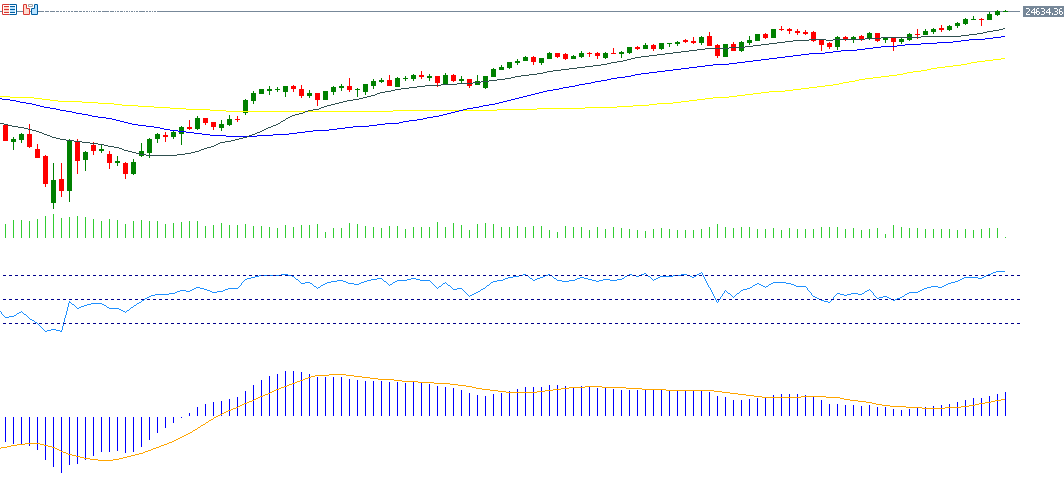 The Nasdaq 100 rose for the third consecutive week, hitting a new record high of 24,642 points on Friday and closing at 24,626. This was driven by last week’s Fed rate cut of 25 basis points, as expected. The dot plot suggests a potential further 50 basis point cut this year. Tech giants (the “Magnificent Seven” or MAGS) pushed the index to record highs, up about 20% year-to-date. The Philadelphia Semiconductor Index (SOX) also reached record levels on Thursday, up roughly 25% since the start of the year, reflecting strong demand for AI-related products and massive investments in infrastructure for the sector. The RSI is currently 74, indicating overbought conditions but strong bullish momentum. The MACD shows a bullish crossover, supporting the Nasdaq 100’s upward trend.