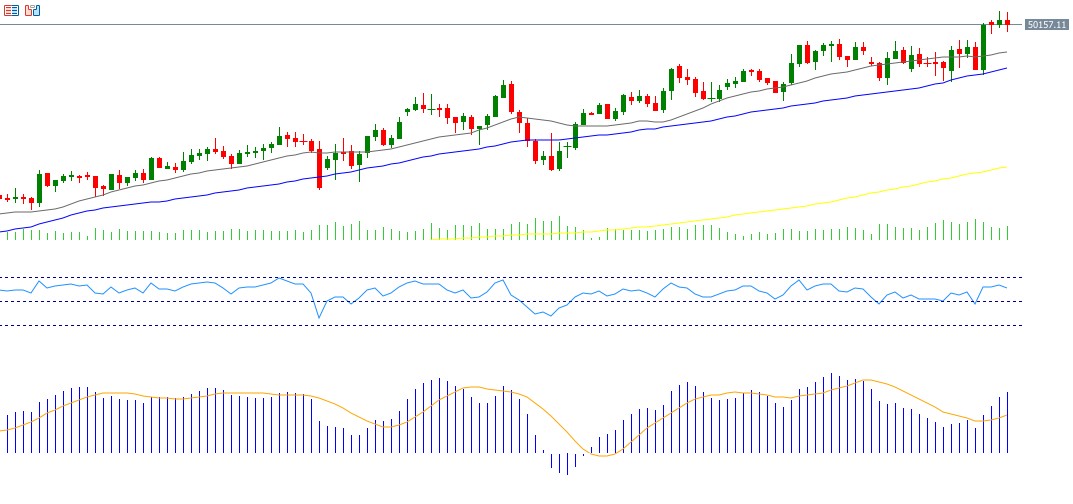 From a technical perspective, indicators continue to point to a sustained upward trend in Dow Jones. The 20-, 50-, and 200-day moving averages remain positively aligned, with the 20-day average above the 50-day, and the 50-day above the 200-day, confirming a supportive technical structure. The Relative Strength Index currently stands at 62, indicating positive momentum, while a bullish crossover between the MACD line and the signal line further confirms the continuation of upward momentum.