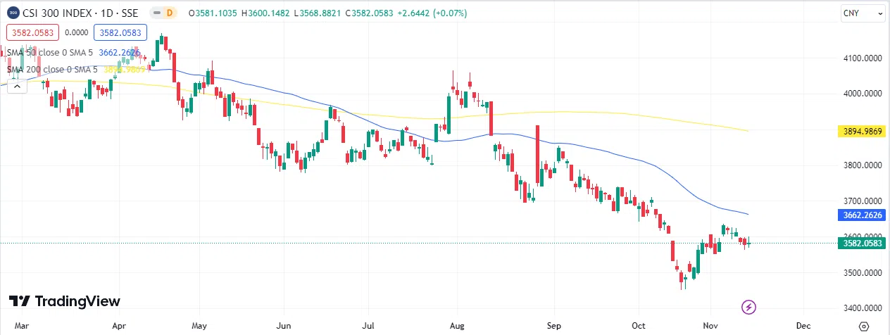 Chinese stocks, particularly the CSI 300 Index, have disappointed investors, currently trading at 3,582 points—below the 50-day moving average of 3,662 points and the 200-day moving average of approximately 3,894 points. The Relative Strength Index sits at around 42 points, below the 50-point barrier, indicating negative momentum for the CSI 300 index.