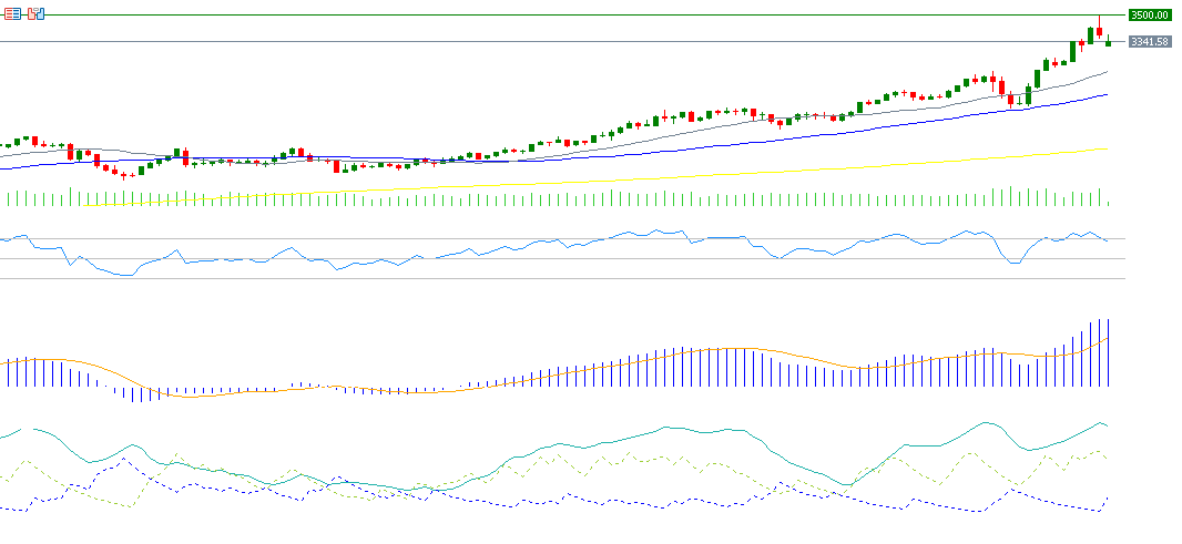 - The Positive Directional Movement Index (DMI+) stands at around 41 points, while the Negative DMI (DMI-) is at approximately 13 points—signaling strong buying pressure. Notably, the Average Directional Index (ADX) is around 42, which confirms the strength of the current uptrend.