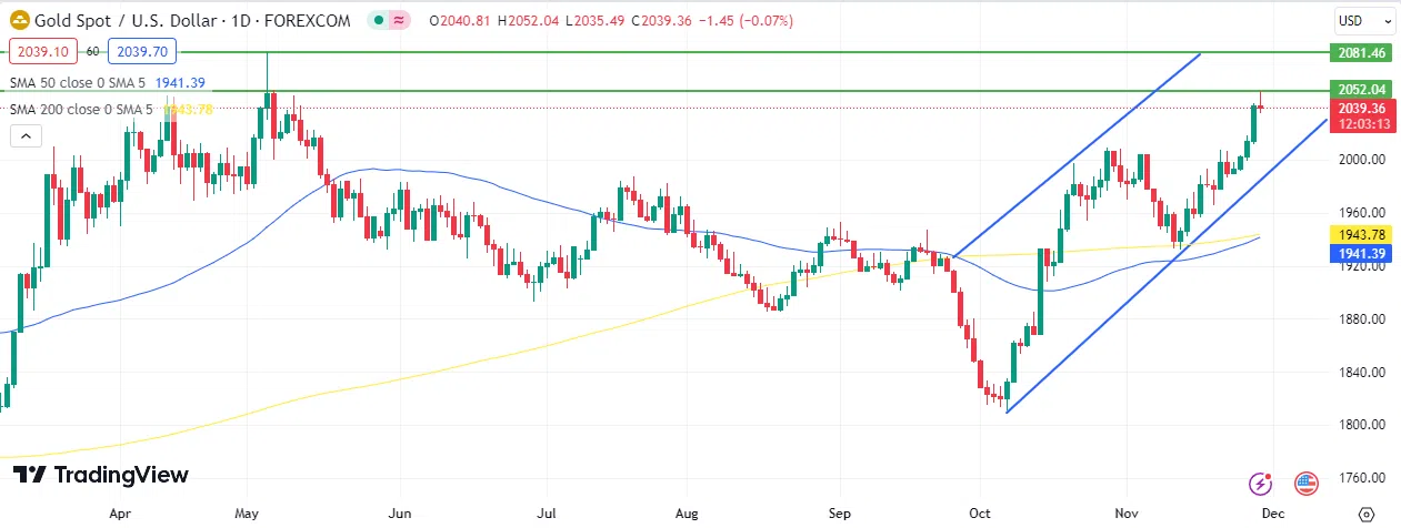 The inverse relationship between the US dollar index, measuring the dollar’s performance against a basket of six major foreign currencies, and gold is pivotal. The US dollar’s weakness, exacerbated after breaking the 103-point support level to a new low of 102.47 today (its lowest since August 11, 2023), is attributed to a slowdown in consumer and producer price indices, along with job data hinting at a potential end to the US Federal Reserve’s monetary tightening cycle. Markets anticipate a stabilization of interest rates at the Federal Open Market Committee meeting on December 13, 2023, ranging from 5.25% to 5.50%. Additionally, there’s a growing expectation of a 43% rate cut in March 2024 and a cumulative 100 basis points cut in 2024.