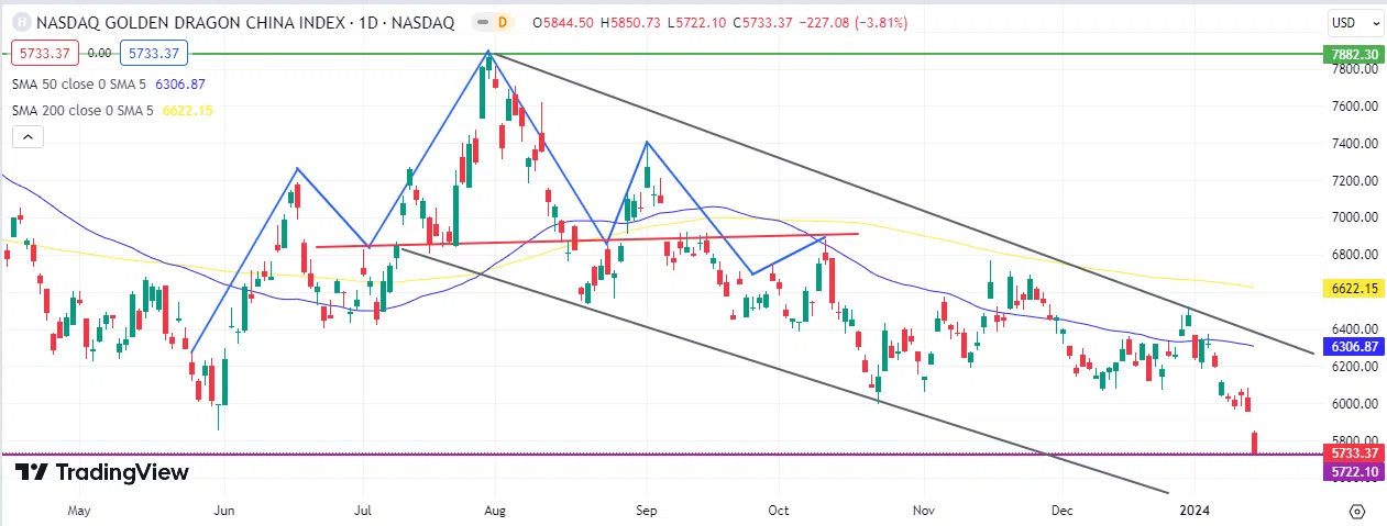 As for the Nasdaq Golden Dragon China Index, which measures the performance of Chinese companies listed in the United States of America, it closed yesterday at 5,733 points, its lowest level since November 28, 2022.