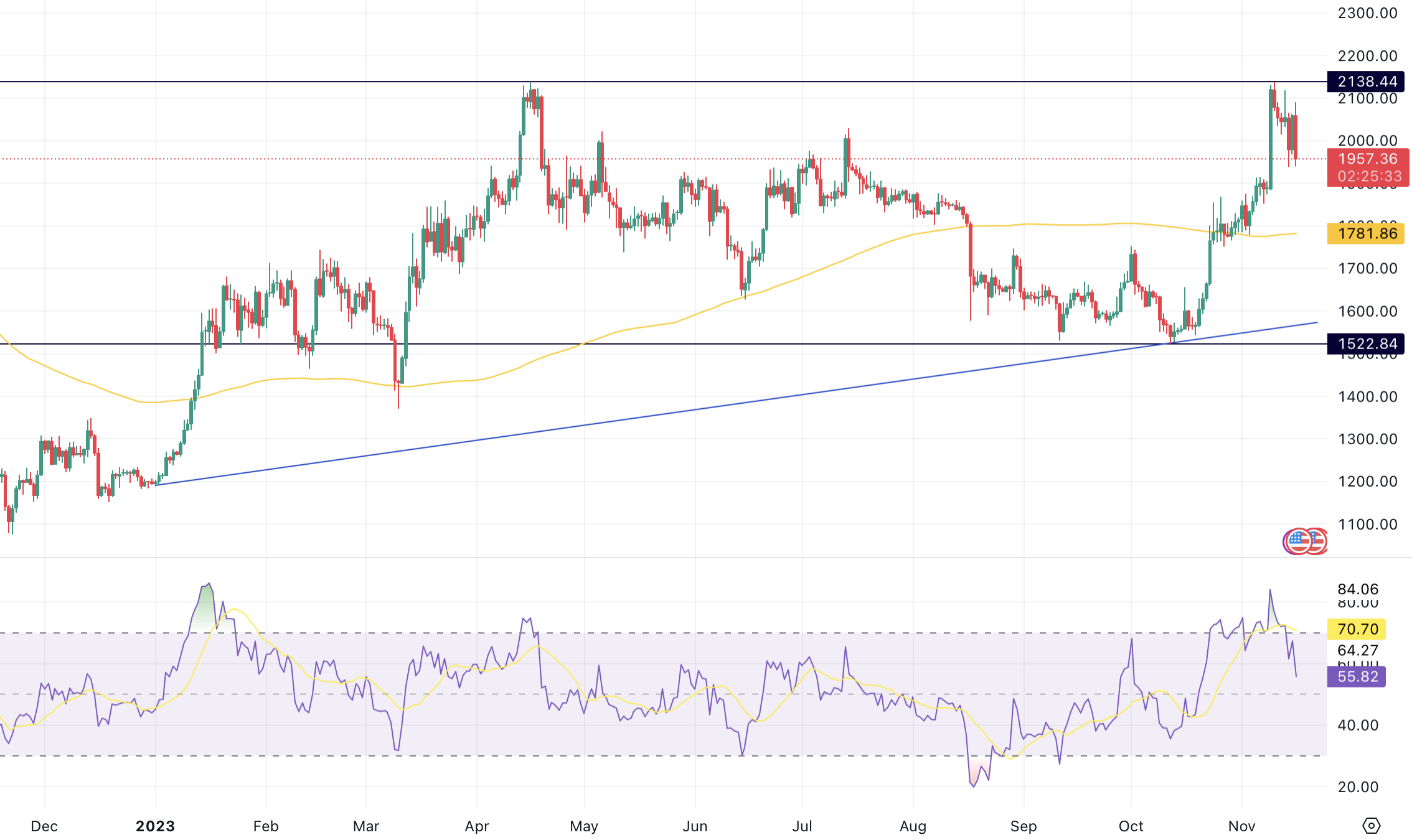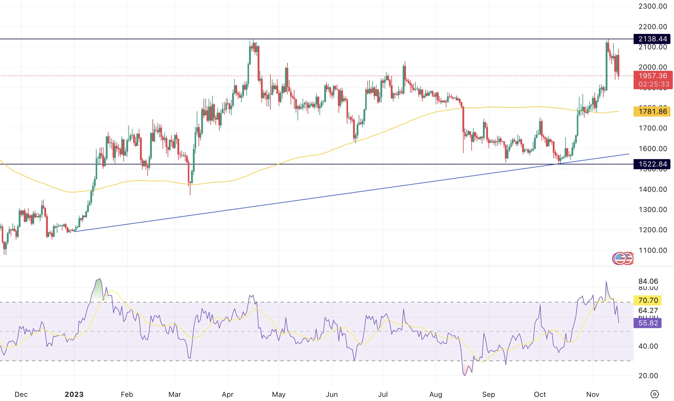 Looking at the chart, Ethereum faces a crucial resistance level of around $2,100 (specifically at $2,138.44). This level has acted as a barrier since April 2023, and a breakout above this point could pave the way for further upward momentum. However, if Ethereum fails to overcome this resistance, it could experience renewed downward pressure, potentially testing its support level at $1,781.86, which coincides with its 200-day moving average. The market has recently overcome an overbought condition, as shown by the RSI indicator.