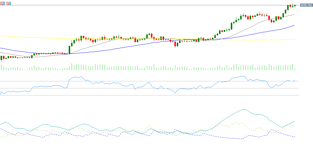 - The Positive Directional Movement Index (DMI+) is around 35, compared to the Negative Directional Movement Index (DMI-) at around 9 — a wide gap indicating strong buying pressure. More importantly, the Average Directional Index (ADX) is around 44, signaling that the strength of this uptrend is robust.