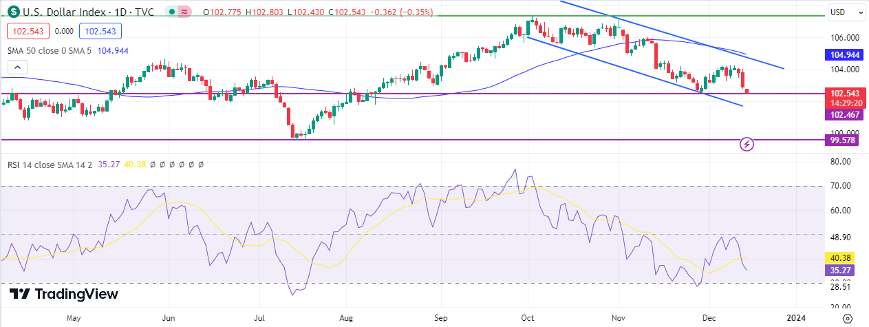 The US dollar index emerged as the primary loser, recording 102.46 points today, its lowest since August 11, 2023, reflecting a significant 4.50% decline from its peak of 107.34 on November 1, 2023. Technically, the US Dollar Index continued its downward trend, trading below the 50-day moving average at 104.94 points and the 200-day moving average at 103.52 points, indicating negative momentum. The Relative Strength Index (RSI) supports the bearish momentum, recording 35 points below the 50-point level and approaching the oversold area.