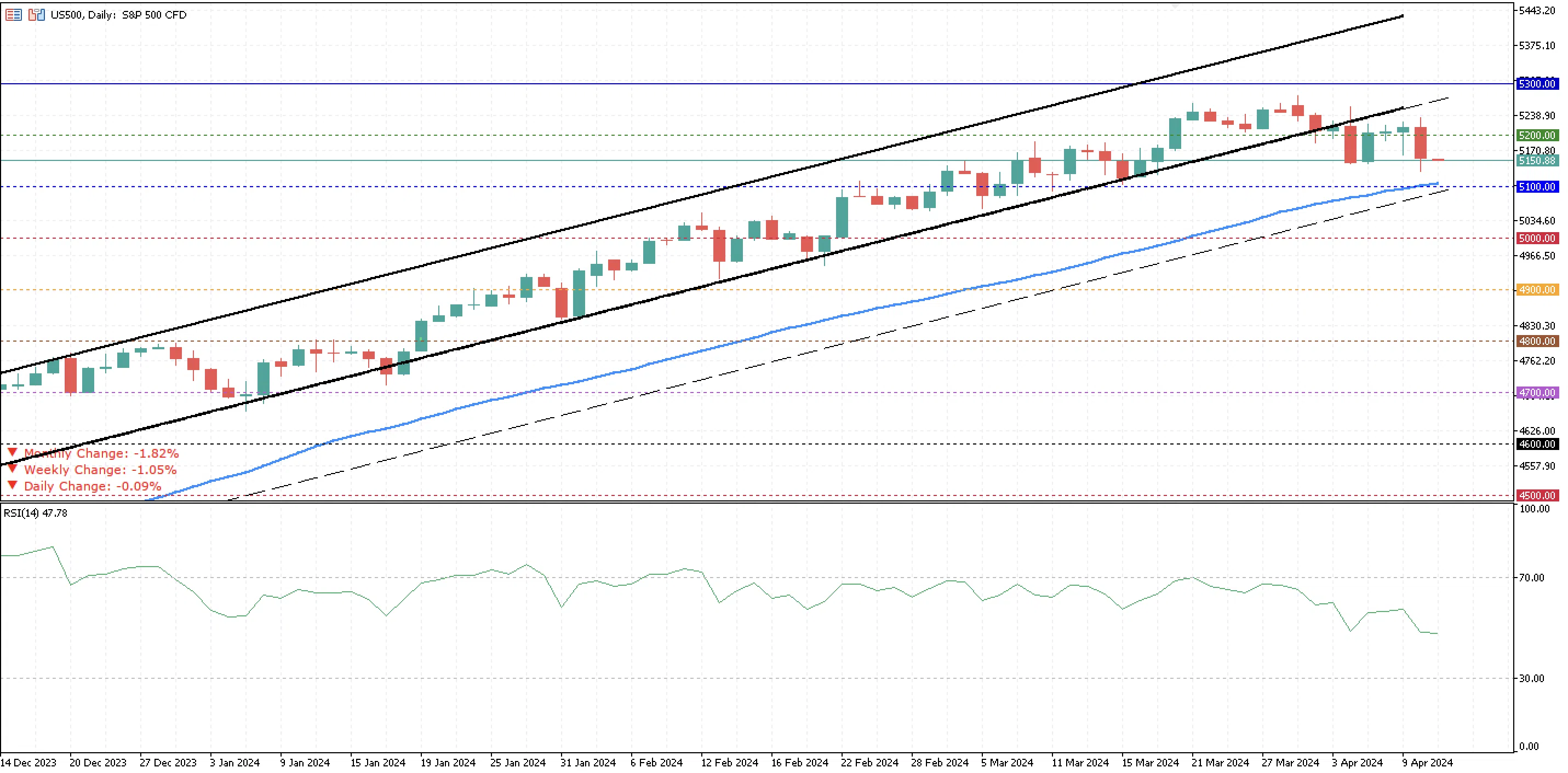 The US500 is now trading below 5,200, and it’s getting closer to its next significant support at the 50-day moving average. Also, there is a second key level to monitor, the lower boundary of the projection of the previous bullish channel the S&P was trading at, which is around 5,100. So far during the month, the Index has lost 1.82% and might be in a consolidating phase around 5,150. The RSI oscillator shows a small increase in the bearish momentum caused by the significant decrease in stocks on Wednesday.