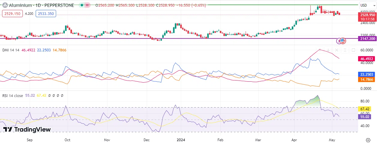 From a technical standpoint, it appears that the upward trend in aluminum prices will persist in the next stage. There is consistency in the 20-, 50-, and 200-day moving averages, all showing an upward trend, with the 20-day average exceeding the 50-day average, and the 50-day average exceeding the 200-day average. The positive movement index (DMI+) is approximately 22 points, compared to the negative movement index (DMI-), which is approximately 14 points. It is noteworthy that there is a significant gap between these two indicators, indicating strong purchasing pressure on aluminum. Moreover, the ADX trend strength index is about 46 points, which is more than 25 points, signifying that the momentum of this upward trend is strong. The Relative Strength Index (RSI) also indicates positive momentum for aluminum, recording approximately 56 points, which is above the 50 level.