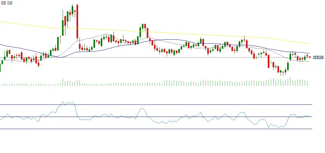 From a technical perspective, crude oil prices are currently trading above a key support level — the 20-day moving average (gray line) at $63.72. The next challenge is whether prices can break above the 50-day moving average (blue line) at $65.70 and subsequently reach the resistance level represented by the 200-day moving average (yellow line) at $68.25.