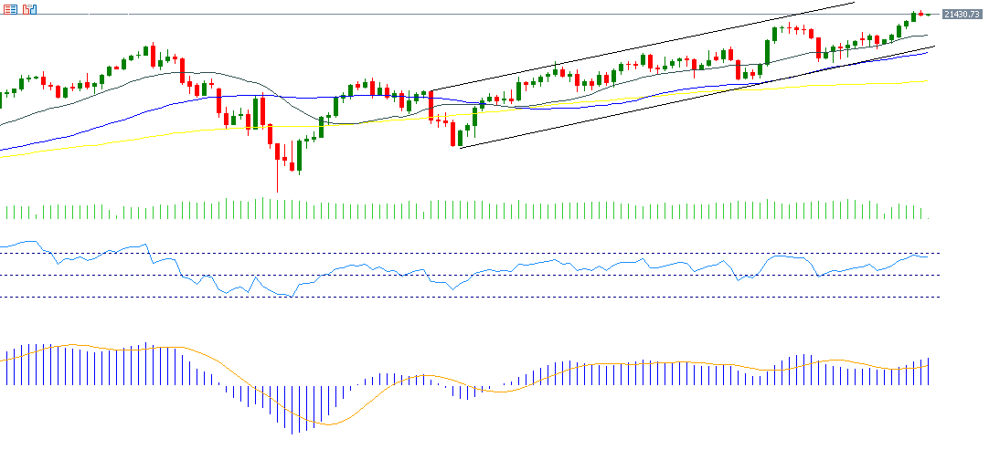 From a technical perspective, regarding the Nasdaq 100 index, there is alignment between the 20-day, 50-day, and 200-day moving averages, all showing an upward trend. The 20-day moving average is above the 50-day, and the 50-day is above the 200-day moving average.