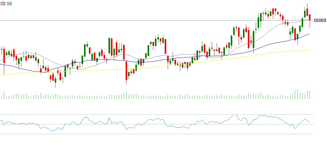 The French CAC40 index rose by 2.77% last week, reaching 8,314 points on Thursday, 13 November 2025, its highest level on record. The index has gained about 23% from the low of 6,764 recorded on 7 April 2025 to the recent peak, and it is up around 11% year-to-date. The RSI is currently at 55, within the buy zone, indicating continued bullish momentum.