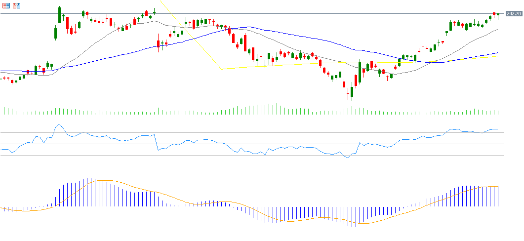Broadcom shares have risen by about 4% year-to-date. Markets are closely watching the company’s financial results, scheduled for Thursday, June 5, 2025. Expectations are for earnings of $1.57 per share, down from the previous reading of $10.96 per share. Revenues are projected at $14.95 billion, up from $12.49 billion previously. The RSI stands at 75, indicating overbought territory and strong bullish momentum. The MACD shows a bullish crossover between the MACD line and the signal line, adding further upward momentum to Broadcom stock.