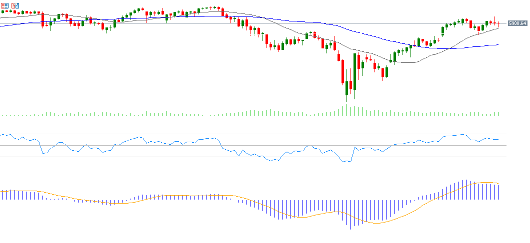 The S&P 500 index rose by approximately 6% in May, marking its highest level since November 2023. This performance was driven by better-than-expected corporate earnings and improved economic indicators such as consumer confidence, despite ongoing trade-related uncertainties. The RSI is currently at 61, signaling bullish momentum. The MACD also shows a bullish crossover, supporting the continued upward trend of the index.