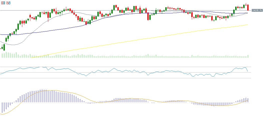 The DAX index continues its upward trajectory, reaching a record high of 20,771 points on Thursday, October 9, and closing at 24,242 points. It has gained approximately 22% year-to-date, outperforming other European and U.S. stock indices. The RSI is around 73, placing the index in the overbought territory and signaling positive momentum.