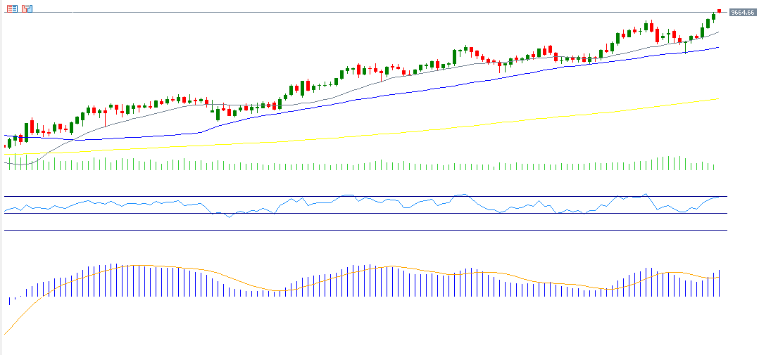 The UK’s FTSE 100 index continues to climb, reaching 9,657 points on Friday, October 24, 2025—its highest level on record. The index has risen roughly 28% from its April 7, 2025, low of 7,533 points to the current peak, and about 18% year-to-date. The RSI currently stands at 68, suggesting the index is in overbought territory but maintaining strong bullish momentum. The MACD also shows a bullish crossover, reinforcing the positive trend.