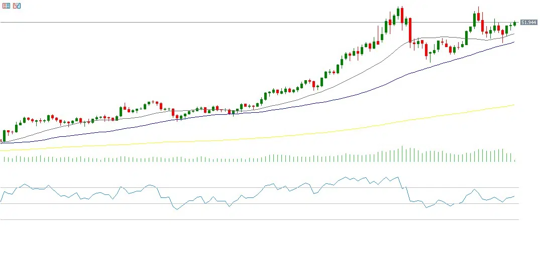 From a technical perspective, the 20-, 50-, and 200-day moving averages remain well-aligned in a clear upward trend. The next key challenge is reaching the major resistance level at $54.40, which prices tested twice this year—in October and November—without a successful breakout. A clear move above this level would open the door to new record highs. Meanwhile, the Relative Strength Index (RSI) currently stands at 59, reflecting sustained positive momentum in silver.