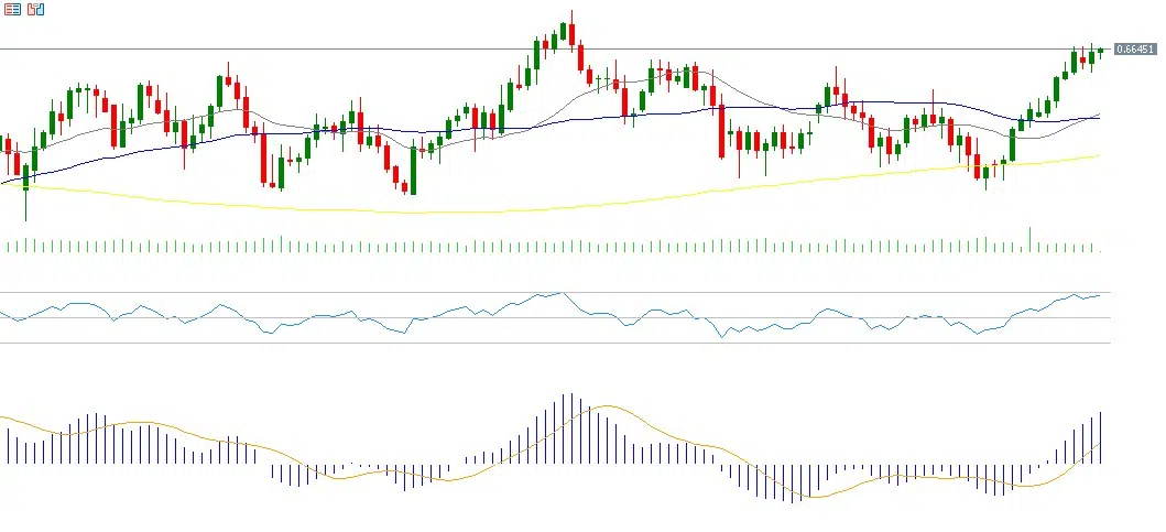 The RSI currently stands at 68, indicating positive momentum for AUD/USD. Meanwhile, the MACD shows a bullish crossover between the blue MACD line and the orange signal line, reinforcing the outlook for continued upside momentum.