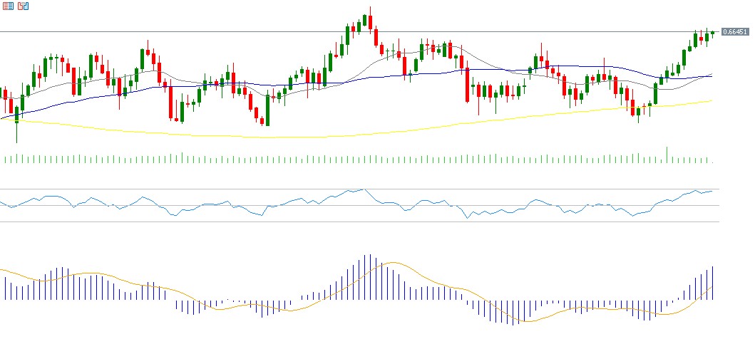 The RSI currently stands at 68, indicating positive momentum for AUD/USD. Meanwhile, the MACD shows a bullish crossover between the blue MACD line and the orange signal line, reinforcing the outlook for continued upside momentum.