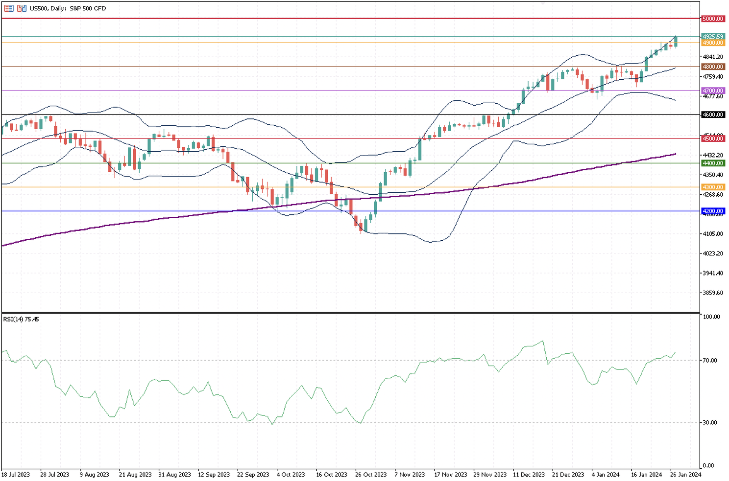 So far, the S&P 500 has gained 3.3% during the month and has remained bullish since October 2023. The new record all-time high is now above 4,900, but a stronger signal must be needed to confirm that the resistance has been broken, such as a second closing price above this level. We have closely monitored the S&P500 trend in the last months, moving in waves about every 100 points. If the bullish trend remains, it will top at around 5,000 in the upcoming weeks. However, the index has entered an overbought condition, as shown by the RSI indicator, and can possibly take a “break” in the upcoming days before resuming its trend.