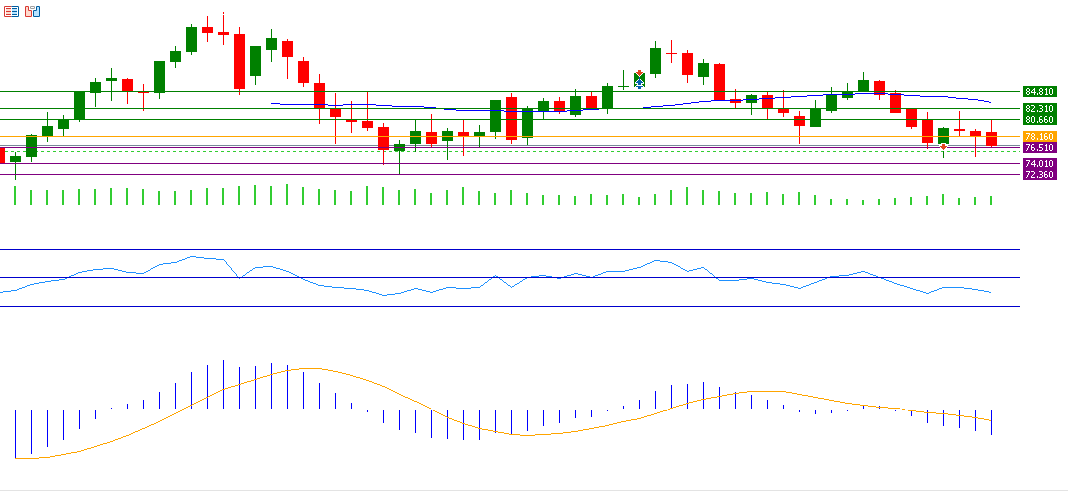 If the pivot point at 78.16 for crude oil is broken, it may target support levels at 76.51, 74.01, and 72.36. Conversely, if the pivot point is surpassed, it could aim for resistance levels at 80.66, 82.31, and 84.81.