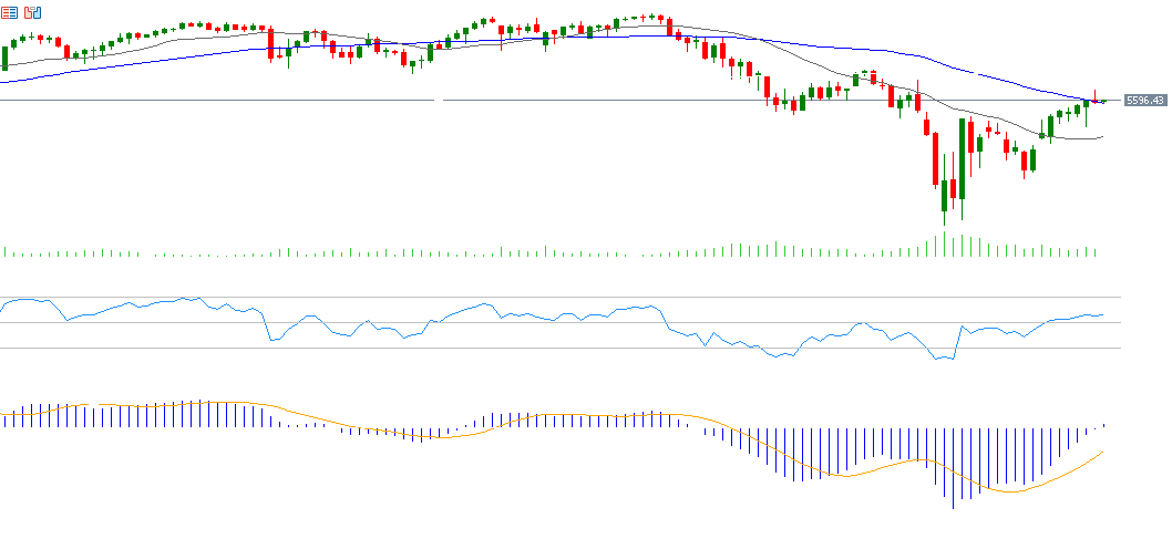 The S&P 500 has broken above the 50-day moving average at 5,592 points. The current key challenge is to reach the record high for the year, at 5,676 points.