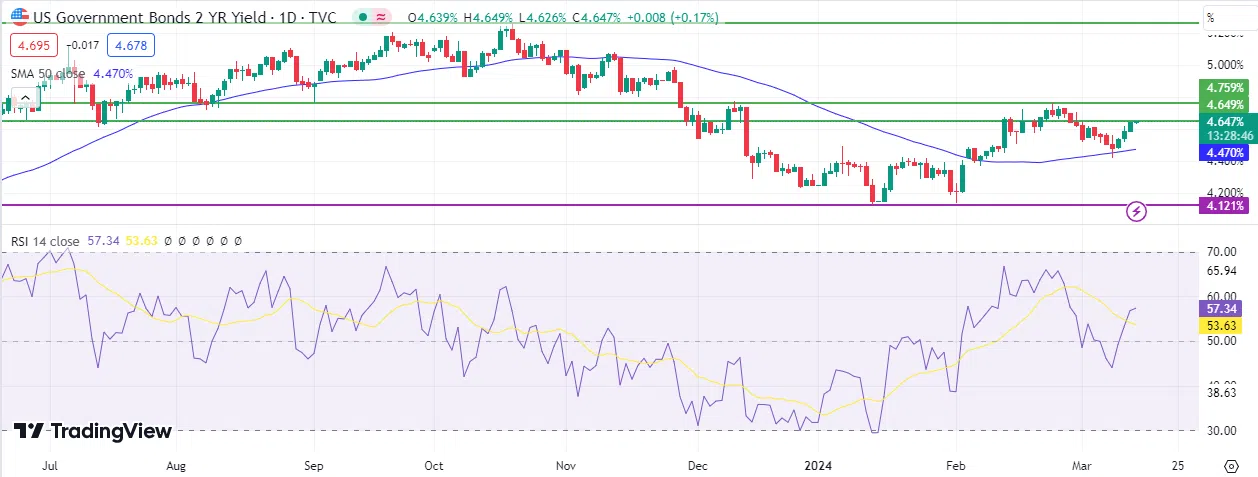 Technically, the momentum appears to be positive for the two-year bond yield, according to the Relative Strength Index, which is currently recording approximately 57 points, and the biggest challenge is reaching the level of 4.759%, which is the highest level recorded this year, specifically on February 23, 2024.