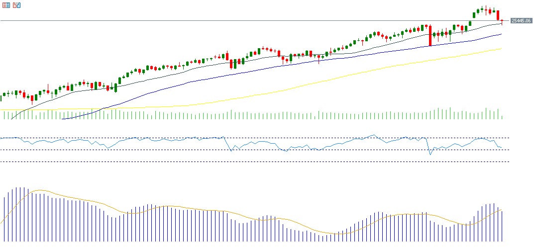 US stock indices closed lower yesterday, pressured by technology stocks related to artificial intelligence. The “Magnificent Seven” (MAGS) index fell more than 2%, while the Philadelphia Semiconductor Index (SOX) dropped over 4%. These declines are, in my view, natural and healthy, especially after the record levels reached recently. It is worth noting that the S&P 500, Dow, and Russell 2000 have all risen for six consecutive months, and the Nasdaq 100 for seven months.