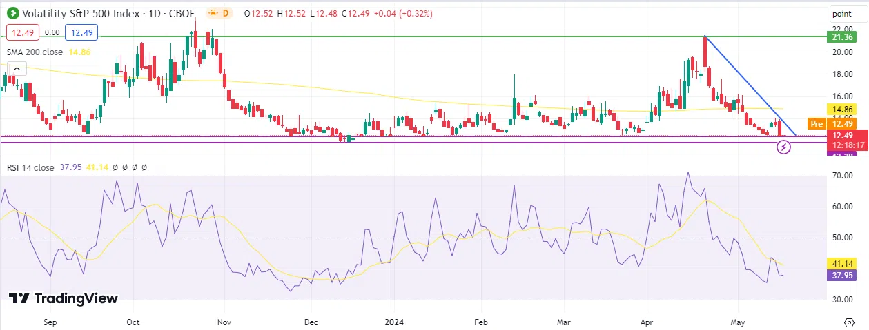 From a technical standpoint, it seems that the downward trend for the VIX index is prevailing in the next stage, with the next challenge for the VIX index being reaching the support level of 11.81 points. The Relative Strength Index (RSI) also indicates negative momentum for the VIX index, recording approximately 38 points.