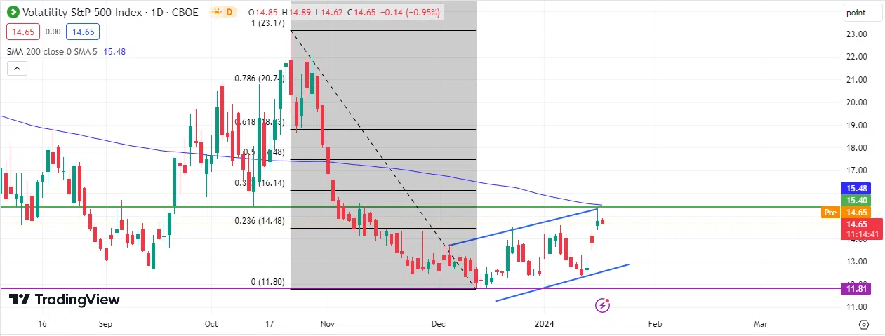 The VIX Fear and Volatility Index, reflecting investors’ anticipated stock market price movements, increased from 11.81 points to around 15.40 points yesterday. This marks its highest level since November 10, 2023, suggesting heightened turmoil and investor unease in the US stock markets.