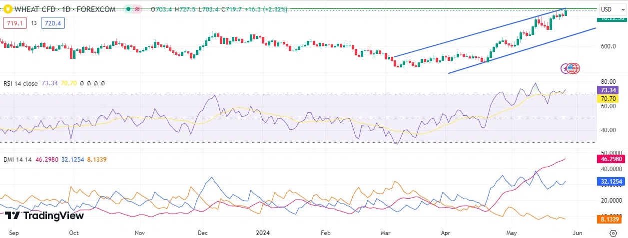 From a technical perspective, the Relative Strength Index (RSI) is approximately 73 points, indicating that wheat is in the overbought zone. The positive movement index (DMI+) is around 32 points, compared to the negative movement index (DMI-), which is around 8 points. This large gap between the indicators suggests strong purchasing pressure on wheat. Furthermore, the green ADX trend strength index, around 46, indicates strong momentum in this upward trend.