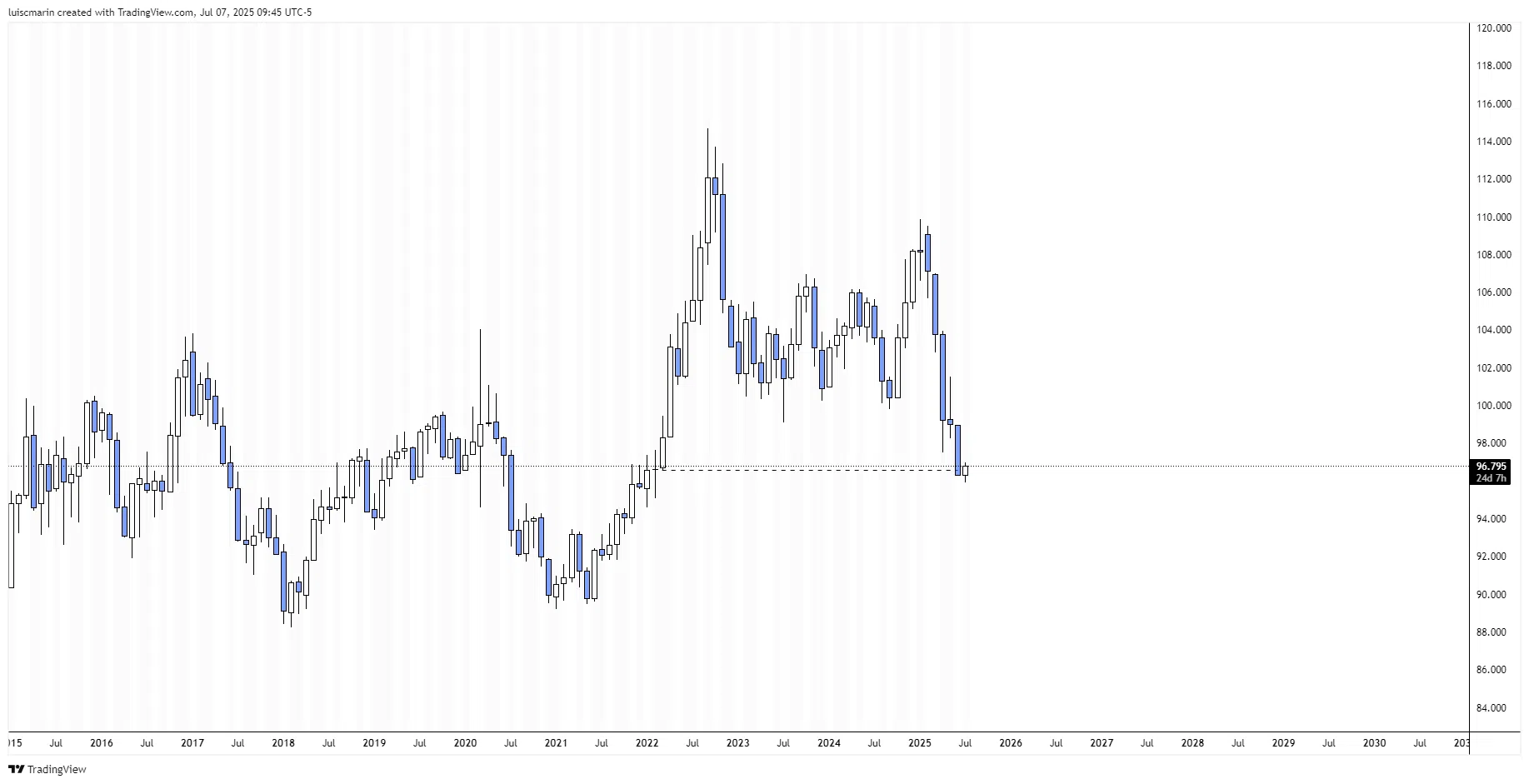 El DXY cotiza actualmente en torno a 96.80, nivel que no visitaba desde hace más de 3 años, como se observa claro en la temporalidad Monthly, perder esta zona abriría la puerta a una caída hacia niveles no vistos desde 2020 – 2021.