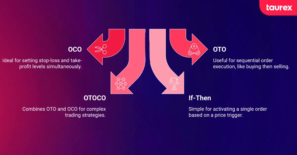 Contingent orders come in several distinct forms, each designed around a specific execution goal. Some focus on loss protection. Others address fill precision or time constraints. Below is a closer look at the most common types you will encounter.