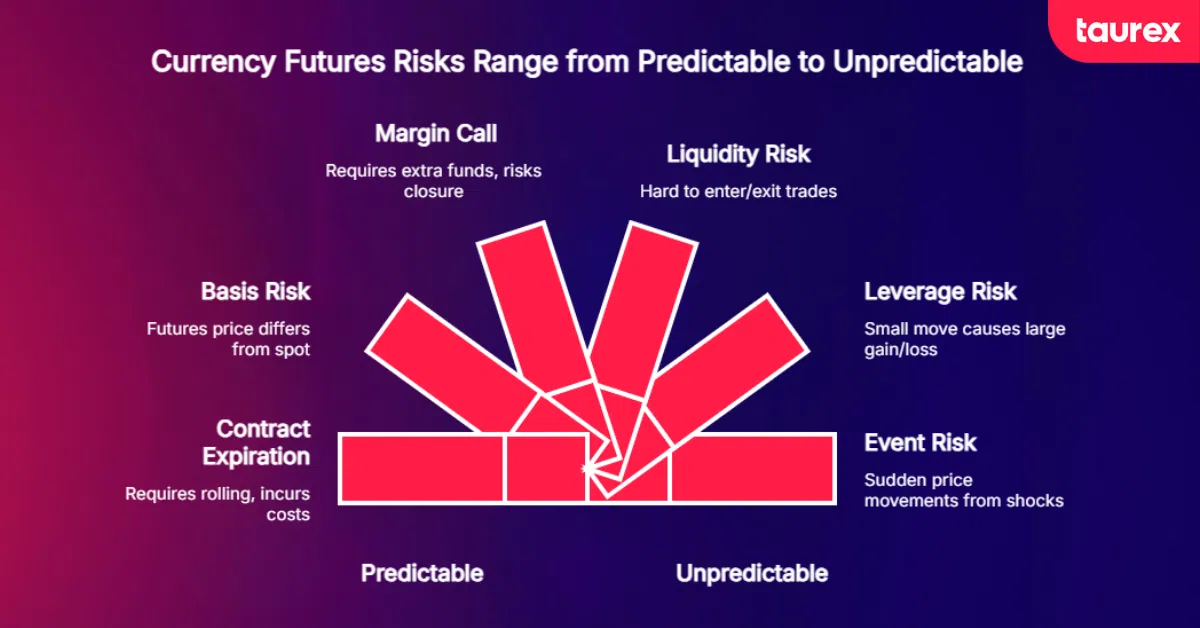 • Basis risk: For hedgers, the futures price may not always match the spot rate at contract expiry. This difference can make the hedge outcome slightly different from expected.