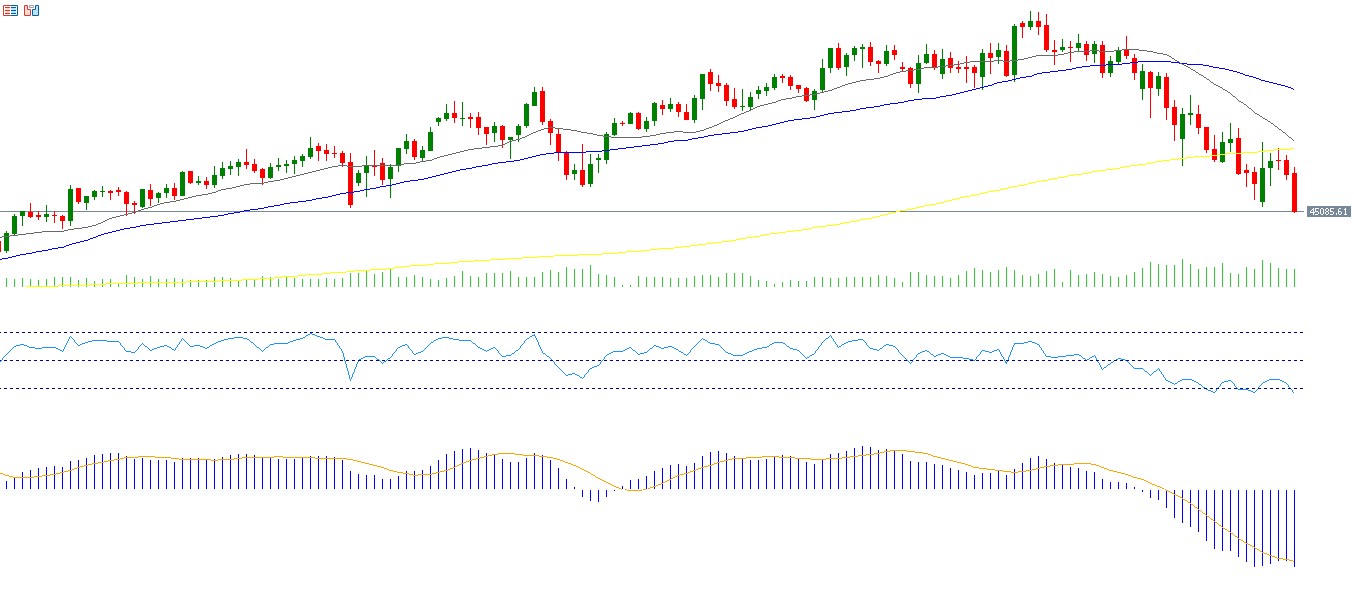 The Dow Jones Index declined by 1.64% last week, marking the fifth consecutive week of losses, officially entering correction territory after falling more than 10% from its peak recorded on February 10, 2026, at 50,517 points to the low recorded on Friday at 45,019 points.
